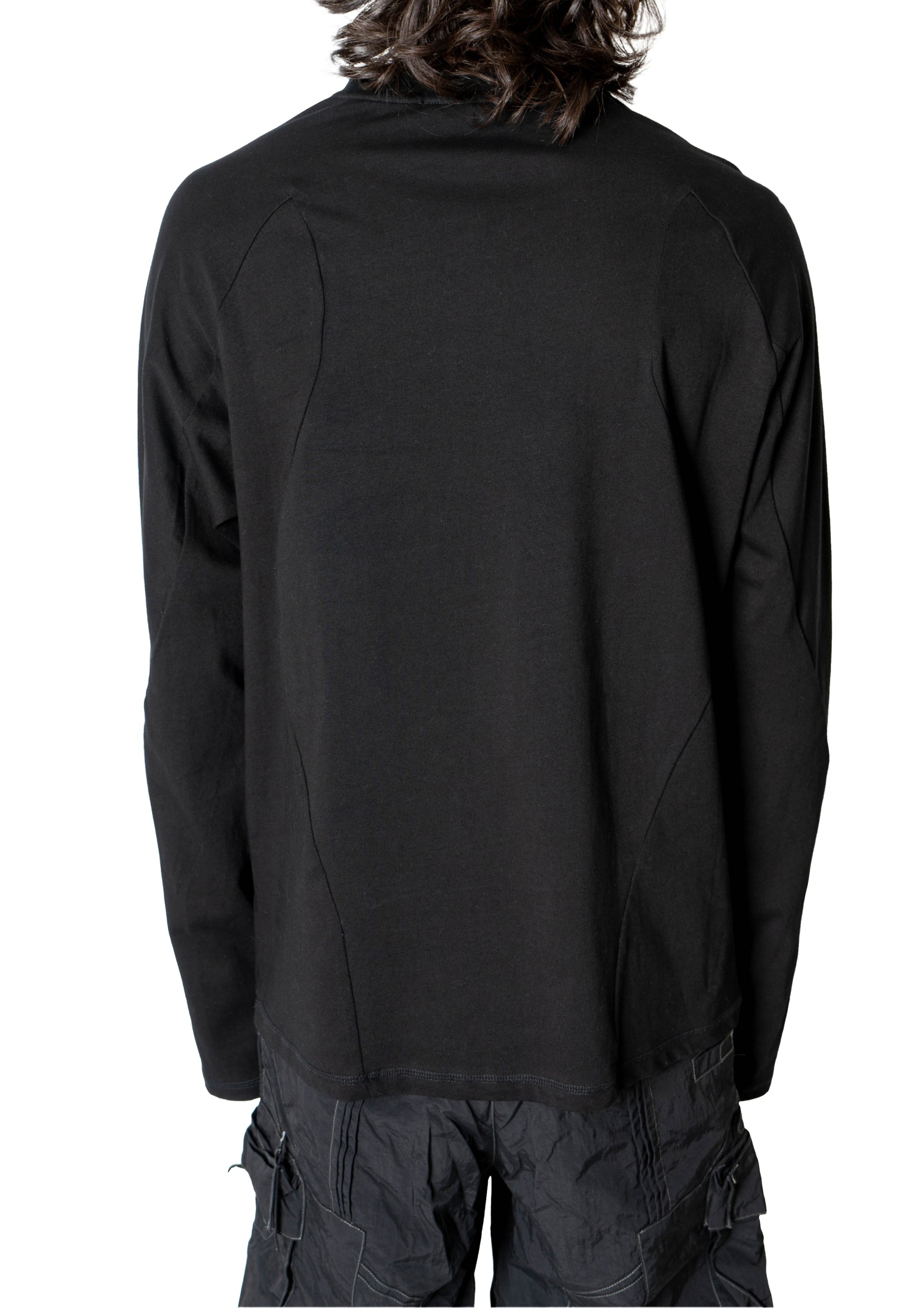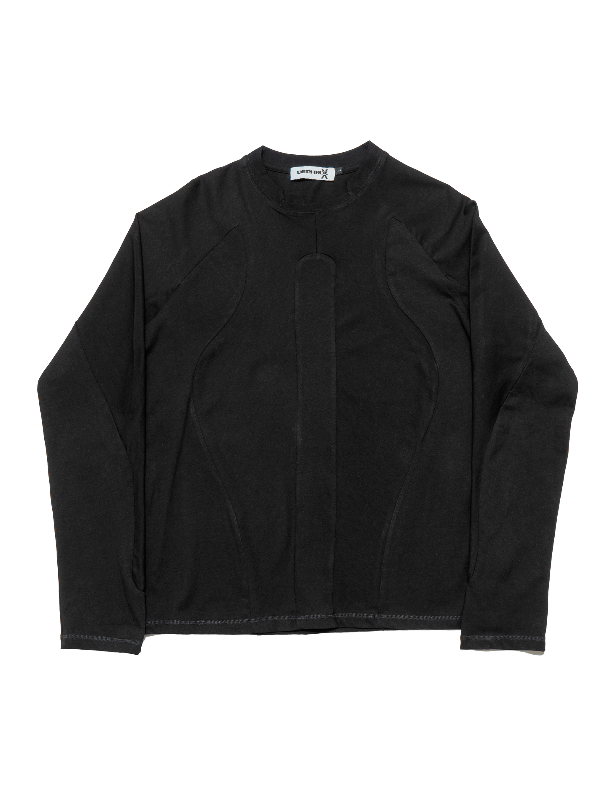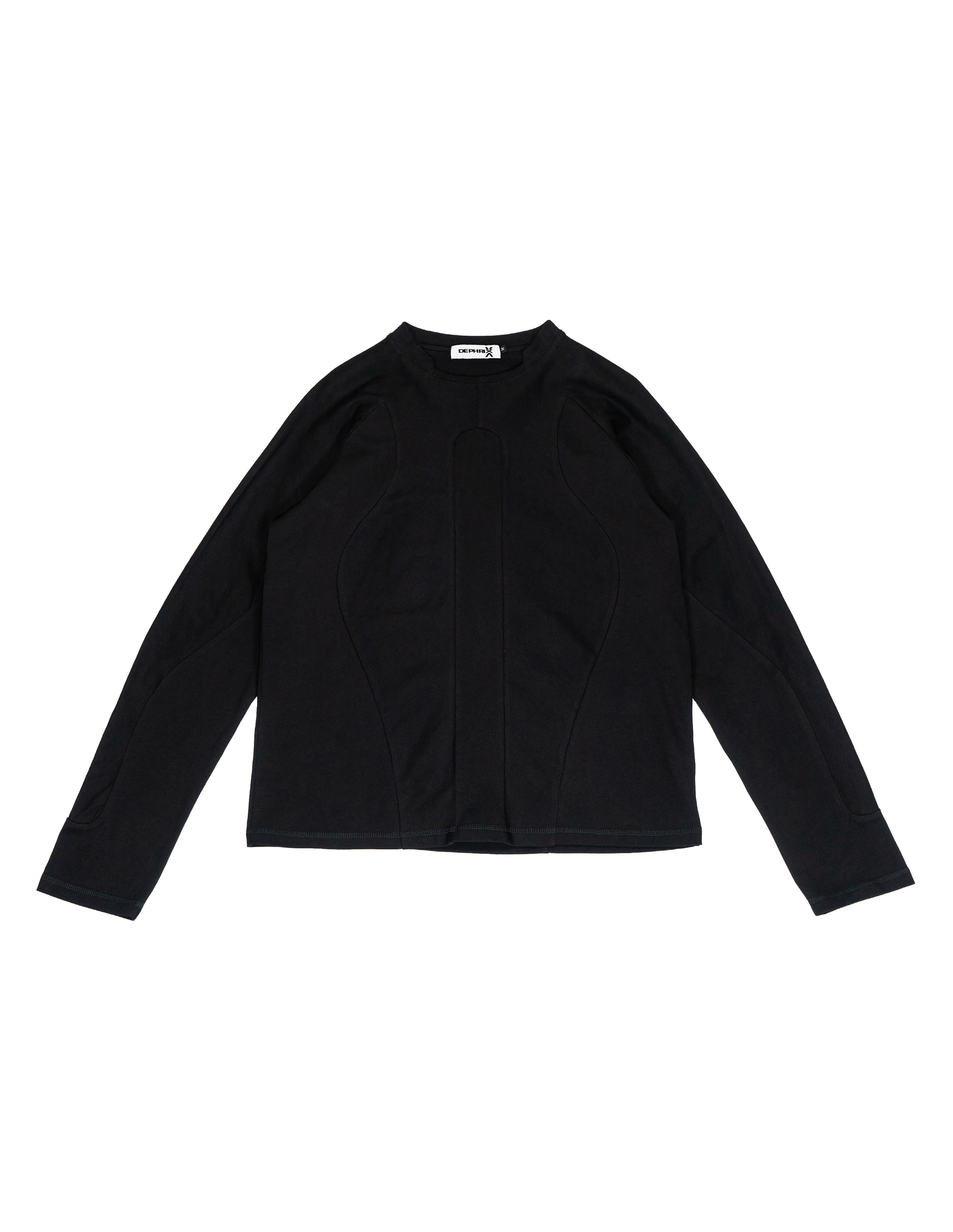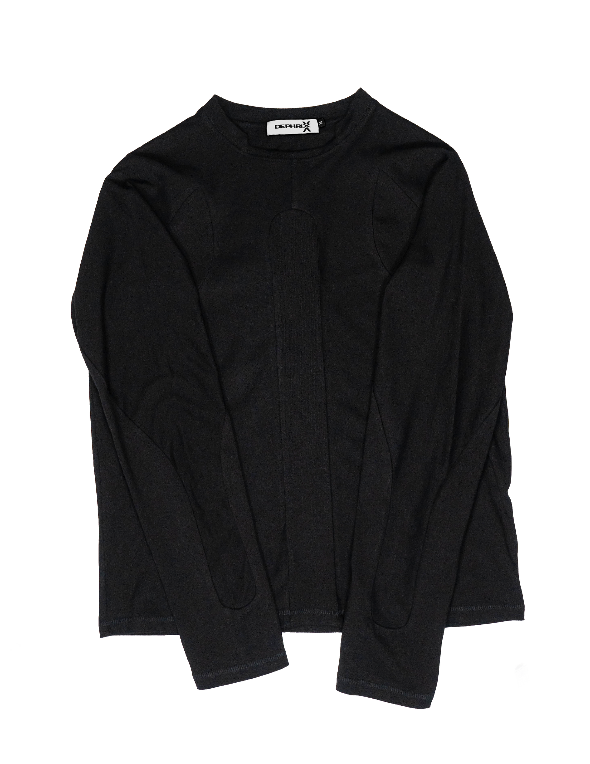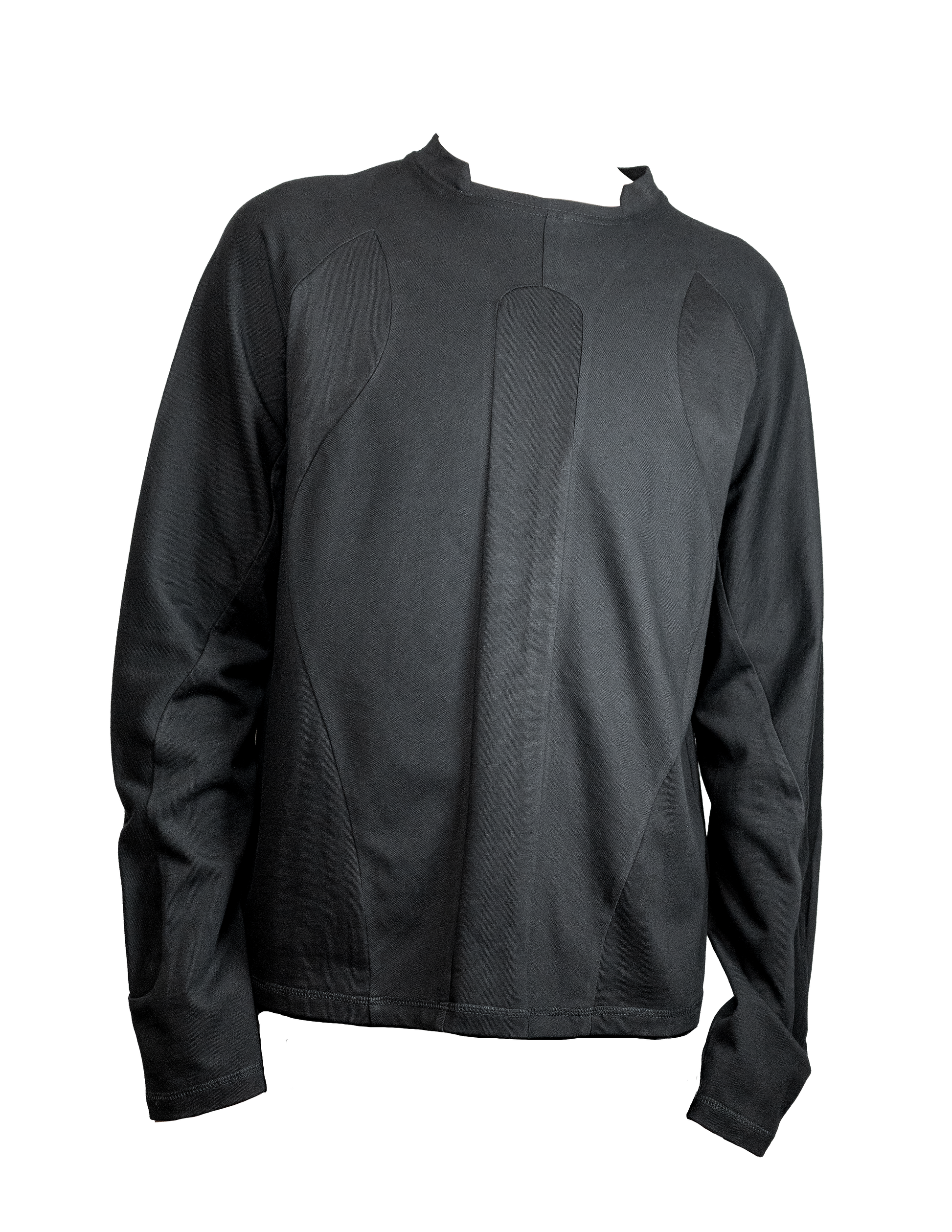 This long-sleeve shirt features seamlessly connected torso and arm panels, an indented ribbed collar, and elongated sleeves.